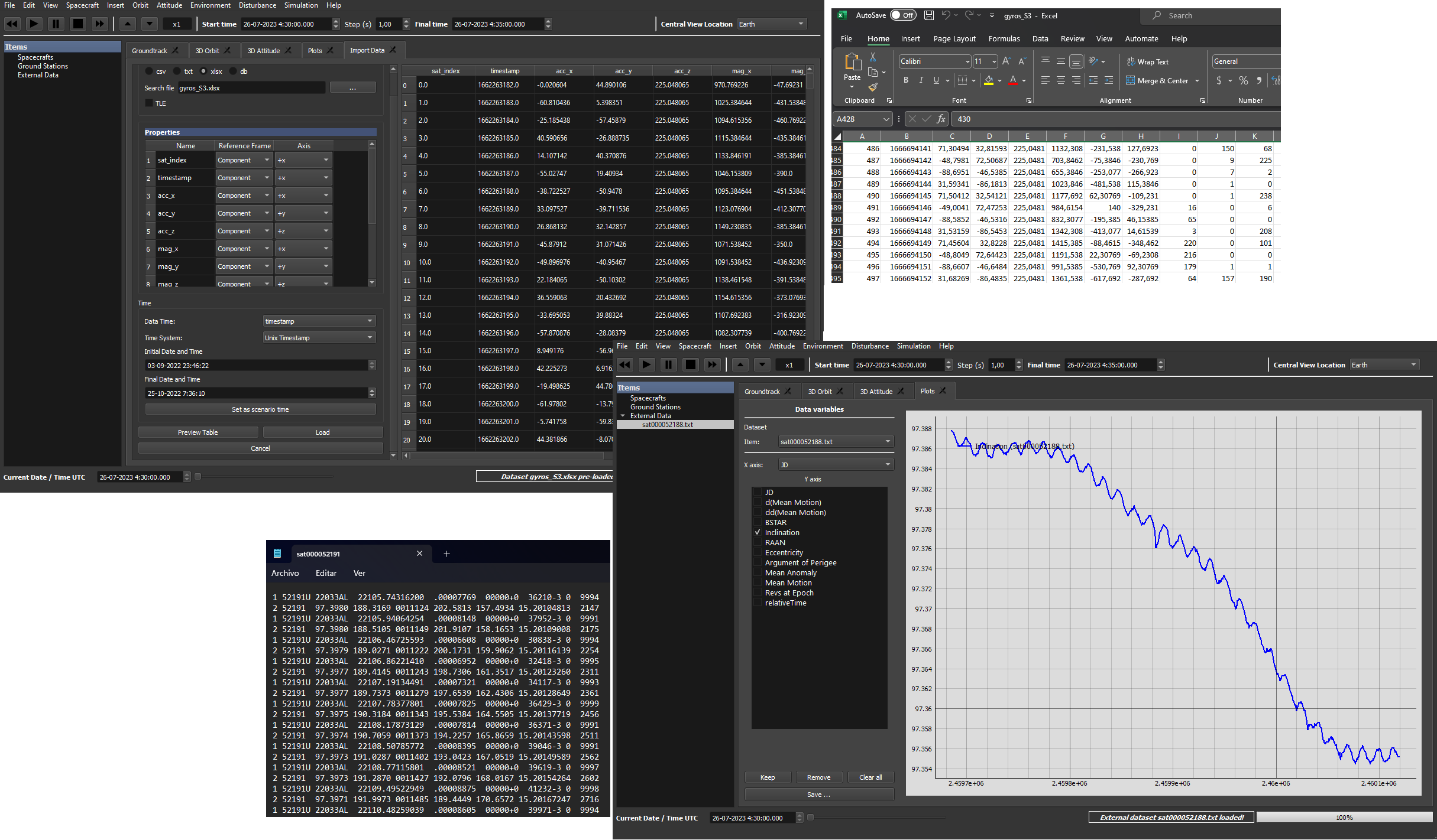 Kuntur allows you to import historical files in TLE format, to analyze the change of orbital elements over the life of the spacecraft.